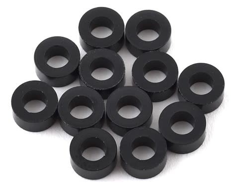 The optional pack of twelve 1UP Racing Black 3x6x3mm Precision Aluminum Shims, precision aluminum shims that are cut on a CNC lathe to strict tolerances before receiving a glossy black anodized finish. Use these with M3 screws or ball studs, or with any 3mm pins to ensure accurate settings every time!