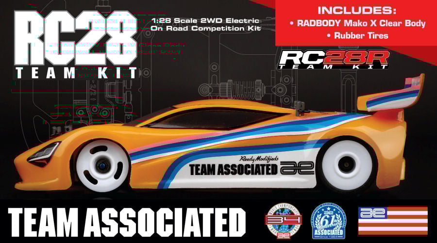Introducing the Team Associated RC28R Team Kit. This compact on-road race car is designed with the same engineering precision found in every AREA 51-developed product. Though small in scale, the RC28R delivers big performance in an easy to set up package. Featuring a fixed-arm front suspension with included optional molded upper arms for tuning caster and camber. The torsion side links (soft, medium, and hard included) replace the need for a side spring making setup easy while adding performance in areas a conventional spring does not. The battery holder design ensures quick access without disturbing the center shock.