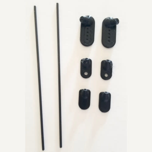 In the package there will be the wing mount, two 100mm long 1.5mm thick carbon rods where as other brands only use 1.0mm rods(you will need to cut to fit your needs) and two different lower side mounting pieces. One will have a hole for mounting with a screw and the other will be solid for using tape or shoe goo. We have been cutting the rod down to 73.5 to 74mm for most of the bodies that we us. The wing strut piece has a depth of 8mm and the side piece has a depth of 6mm.