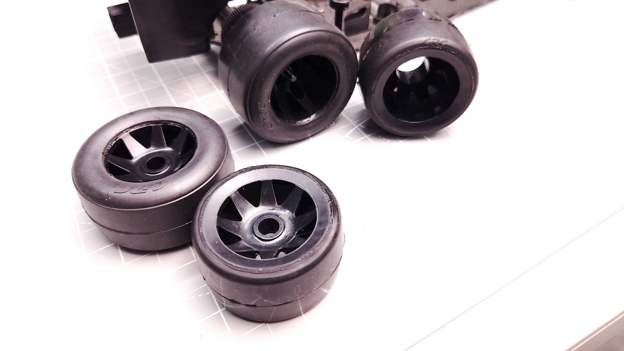 CRC’s new Low Profile rubber (LPR) tires for 1/10th onroad and oval racing. These tires develop high traction with the “racy” low profile design and high grip rubber. The lateral grip force is very high! The 2.15″ diameter (54.5mm) matches popular foam tire sizes so it is very easy to go from foam to rubber tire racing. The CRC GT wheel is race proven, very durable with a proper front bearing fit.