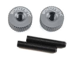 Exotek M3 Twist Nuts are precision machined thumb screws that are the perfect option to customize the battery strap screws on many of todays 1/10 vehicles. They are available anodized in a variety of colors to match your paint scheme and feature a knurled surface that makes installation/removal easy. Compatible with most vehicles that use 3mm screws to secure the battery strap. Package includes two thumb screws and two 3mm threaded rods.