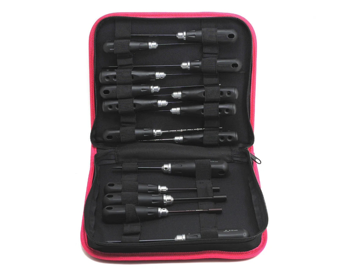 | HUDY profiTOOLS Complete Set features 15 most frequently used hand tools for all types and scales of R/C cars, including: Allen wrenches, slotted screwdrivers, Philips screwdrivers, and socket drivers… all nicely packaged in a handy carrying bag. This complete set comes badged with a super low price making it a perfect starting tool set for any hobby enthusiast. HUDY profiTOOLS are based on highly-successful HUDY Professional Tools used by RC factory teams and world champions, and are available in most popular sizes and types. Each tool has a special, CAD-designed tip made of world-renowned HUDY Spring Steel™ to very precisely fit the corresponding fastener, allowing unmatched torque and long life. Special shaped, comfortable molded handles with machined hubs are designed to allow easy tip exchange. |