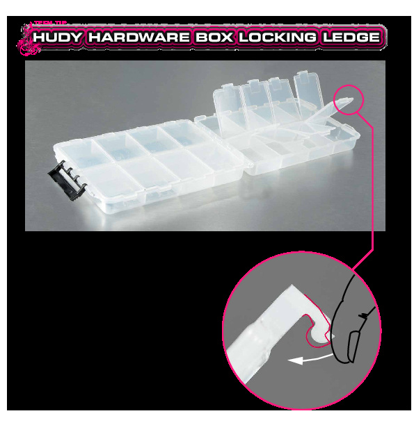 | Very handy and useful double-sided box for hardware storage. Tough, durable translucent plastic box has 8 internal compartments on each side and a separate latching cover on each side. Easy, quick-access storage for small parts. High-quality HUDY graphics. |