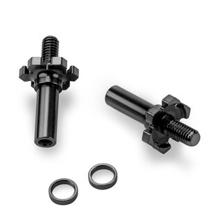 Titanium material lowers the weight, increases strength over aluminum and increases the bling factor by 10-fold. The JConcepts axle is adjustable and with the included aluminum 1.5mm spacer, a wider track width can now be achieved very quickly and effectively. Included in each package are two Titanium axles and two aluminum 1.5mm thick spacers which can be positioned inside or out to change track width. It is recommended to start with a stock width setting (1.5mm spacer placed inside) during initial build and assembly. Adding the spacer to the outside is equivalent to utilizing a standard 6mm hex adaptor.