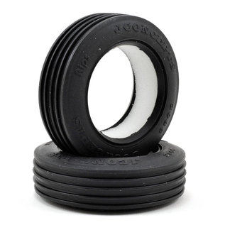 The Rips fit a classic style 1.9” sized wheel giving the buggy an era correct appearance in size and proportion. The high-traction tires are produced in JConcepts sticky green (Super Soft) compound and include And-1 open cell inserts for increased support. The Rips are modeled after the original kit front tires with a slightly rounded side-wall that progressively angles toward the top. The rounded edges of the Rips peak out and return to the base exposing the deep Ripped ribs which tile out as an evenly spaced 5-rib tire. The smooth and grippy feeling of the front tire is immediately felt on rough terrain and more specifically low grip, loose and wet conditions. The vintage inspired tire lettering, along with finely detailed, crisp, JConcepts ribs finish off an all out effort for vintage racing.