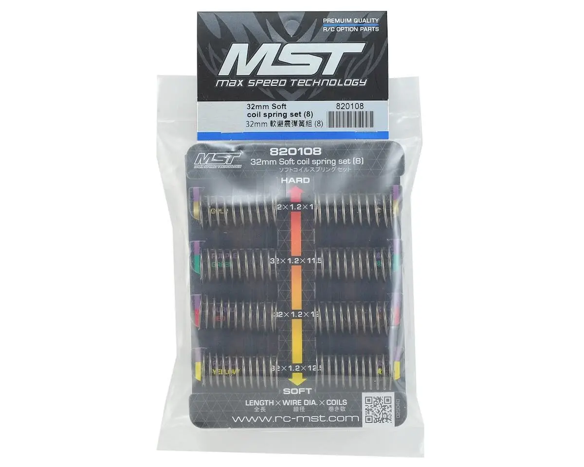 The MST 32mm Soft Coil Spring Set is compatible with the full range of MST drift chassis', and is a must have for those who are serious about tuning. Available in Hard, Medium, Soft, Super Soft and Extreme Soft spring rates, this soft rate 32mm spring kit includes all four rates available in the soft range.