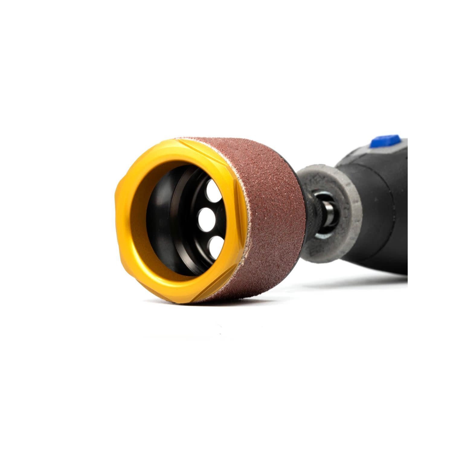 Manufactured in Italy using high-quality aluminium, the cylinder is shaped to accommodate two rubber rings, ensuring a perfect grip of the 'sanding band', secured by a gold-anodised threaded nut. The cylinder also features lightening holes on its base and houses a steel pin fixed by interference.