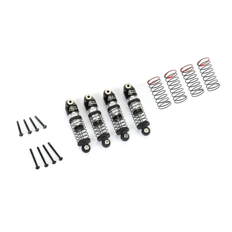 Pro-Line Axial SCX24 Aluminum Big Bore Scaler Shocks. These optional high quality big bore shocks are intended for the Axial SCX24 platform as a performance upgrade to replace the stock plastic friction dampers. Features an all aluminum design with leak-prof double O-ring seal to ensure that the oil stays in place under all conditions, with threaded and an oil-filled design to provide extra tuneability and adjustments for smooth damping action!