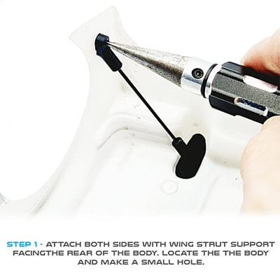 These rear fender stiffeners combine very thin carbon rods with the latest 3D Printing technology to provide a feather weight of only 2g each! They also act to strengthen your wing struts and also as a nut to attach your wing. Simply drill your wing holes at the same position as the mounts, and attach your wing!