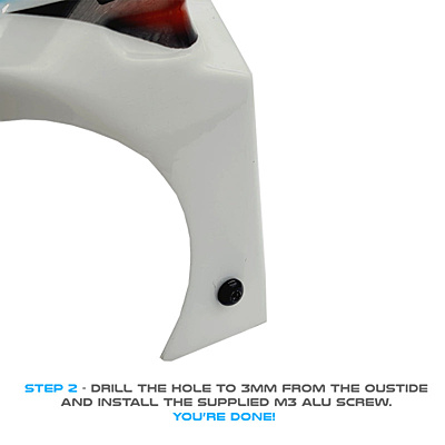 The stiffener set comes pre-assembled and includes all mounting hardware for installation, except the wing mounting screws. We recommend using screws with an 8mm length and didnt supply them as many people like to use their own fancy screws! The supplied M3x5 Alloy screws are great to keep the weight down and attach the Anti-tuck to behind the rear wheel arch.