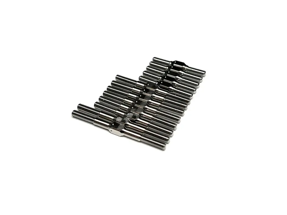 Each turnbuckle is CNC-machined from premium Grade 5 (6Al-4V) titanium with precise M3 threads for consistent, repeatable tuning. Left-hand threads are marked with a machined dimple for quick identification, and 4 mm wrench flats provide secure engagement during adjustments.