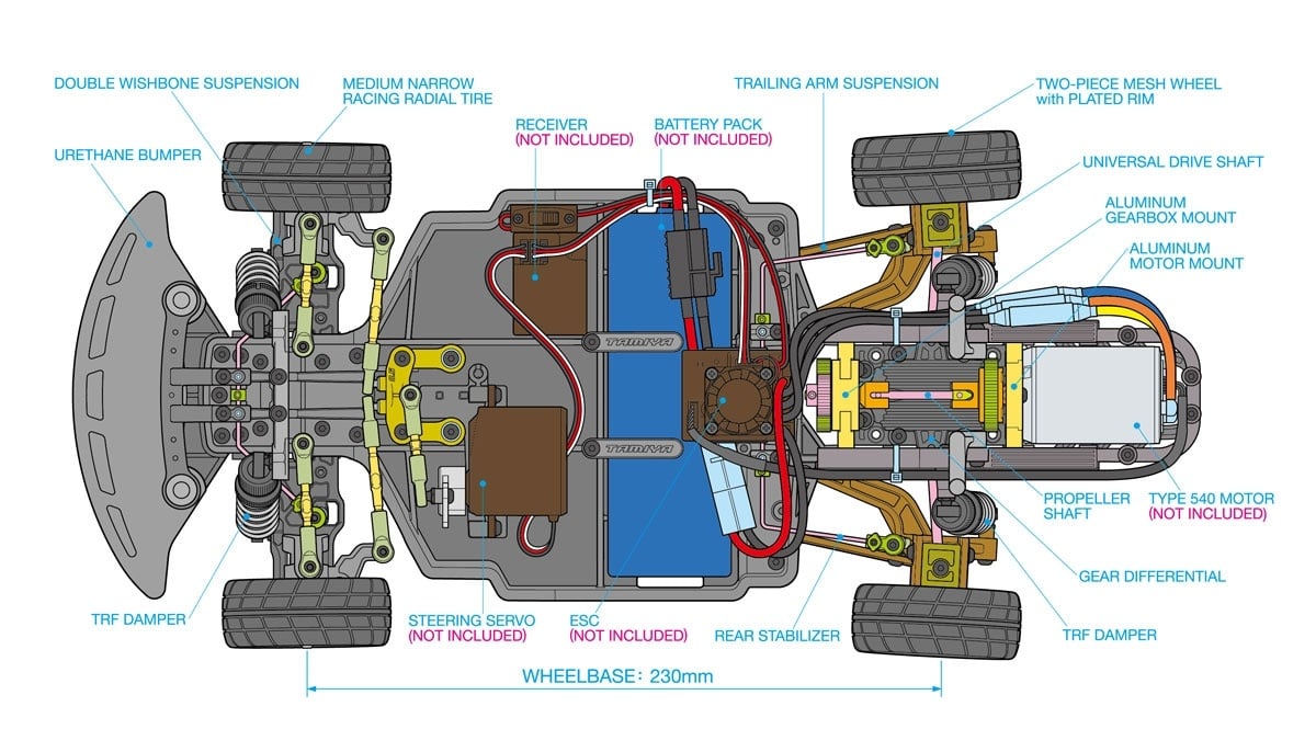 The kit-standard wheelbase is 230 mm, optimized for the trailing arm rear suspension. For additional versatility, the rear layout of the lower deck can be modified to support a 251 mm wheelbase using a double wishbone rear suspension; a separately sold body is required for this configuration. Builders can also choose between traditional body mounting with holes for a durable driving model, or a magnet-and-metal mounting system for a clean, display-oriented appearance.
