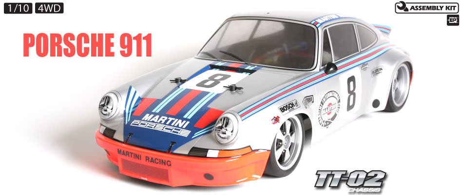 The Porsche 911 Carrera RSR joins the Tamiya TT-02 chassis touring car entry level line-up. It is a legendary Group 4 car which had a body weighing just 900kg with a 300hp-plus horizontally opposed 6-cylinder engine, and still holds a place in automotive enthusiast's hearts today thanks to its exploits with racing teams the world over. In 1973, the year of its release, it won the European GT Championship, plus the renowned 24 Hours of Daytona and 12 Hours of Sebring races. The works prototype in predominantly silver livery with the Martini stripe also took the checkered flag in the famed Targa Florio race.