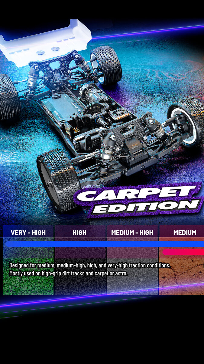 The XRAY XB4’25 Carpet (XB4C) and Dirt (XB4D) Editions are meticulously engineered to redefine 1/10 electric 4WD competition buggies. For the Carpet Edition, enhancements like the multi-adjustable slipper one-way clutch and aluminum central bulkhead elevate performance on high-traction surfaces. Conversely, the Dirt Edition employs a central gear differential and composite central bulkhead to maximize traction and consistency on low-traction tracks. Both models feature improved anti-roll bar geometry with super easy adjustment from the top, offering seamless adaptability. Graphite suspension components and innovative steering designs ensure precise handling, while updated shock towers and body configurations lower the center of gravity (CG) for enhanced cornering stability and speed. These forward-thinking upgrades make the XB4’25 is an exceptional choice for racers seeking competitive excellence tailored to specific track conditions.