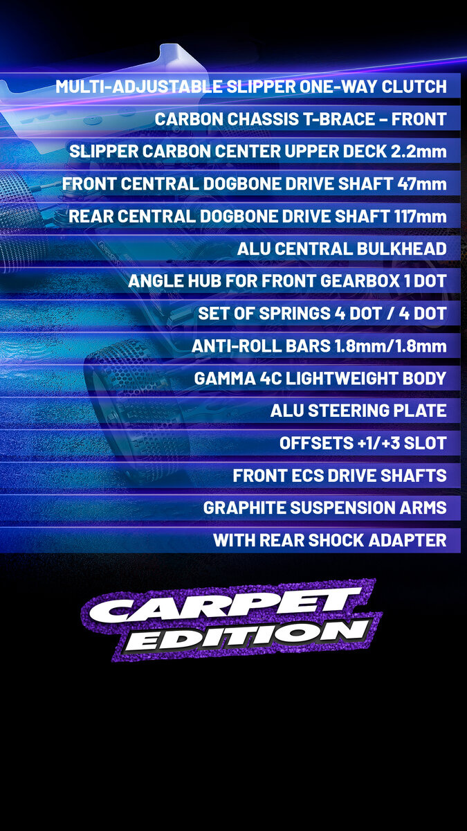 The XRAY XB4C and XB4D chassis layouts showcase advanced flexibility for optimal performance across different terrains. The Carpet Edition's carbon chassis T-brace and slipper carbon center upper deck offer rigidity and durability, essential for the high-speed precision required on high-traction tracks. Meanwhile, the Dirt Edition employs a carbon chassis brace and differential carbon center upper deck, providing balanced flex characteristics to maximize grip on looser surfaces. Both kits feature adjustable rear transmission positions, enabling racers to switch between short and standard wheelbase setups for ultimate control. The Gamma 4C lightweight body on the Carpet Edition enhances stability through high-speed corners, while the Gamma 4D body of the Dirt Edition optimizes rear-end traction for tighter, technical layouts.